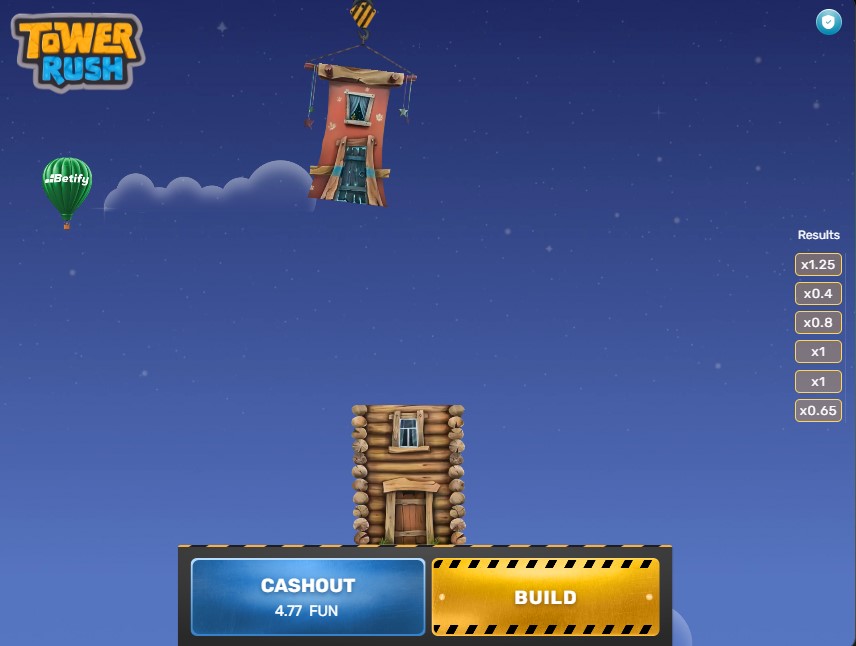 Haz clic en el botón amarillo «BUILD» y observa la casa suspendida balancearse sobre el edificio. El momento exacto en que sueltas el ratón o tocas la pantalla determina si la casa cae en el lugar correcto o se derrumba. Cada colocación exitosa añade un multiplicador aleatorio a tu acumulado.